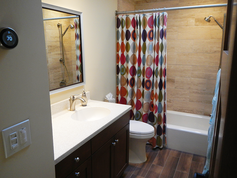 Nestled in the woods stands a handsome contemporary home with beautiful Asian influenced decor. We created a stunning master bath with floating custom cherry vanity.. featuring a copper flecked quartz vanity top, cherry rice paper paneled closet doors and custom tile to create a spa retreat. Renovated an additional bath, installed "Warm Board" (water in-floor heat system) on the second floor, matched existing wood flooring in the kitchen with new wood flooring in the first floor office, as well as helped execute a beautiful custom desk, stained/varnished/installed new craftsman solid wood maple doors on the second floor as well as all interior second floor painting.
